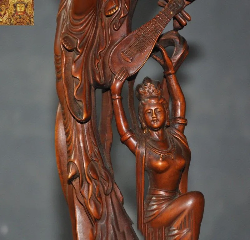 Product Name: Bruiloft Decoratie 15 "Chinese Buxus Hout Gesneden Oude Fluit Luit Muziek Belle Girl Beauty Standbeeld Nieuwe Jaar